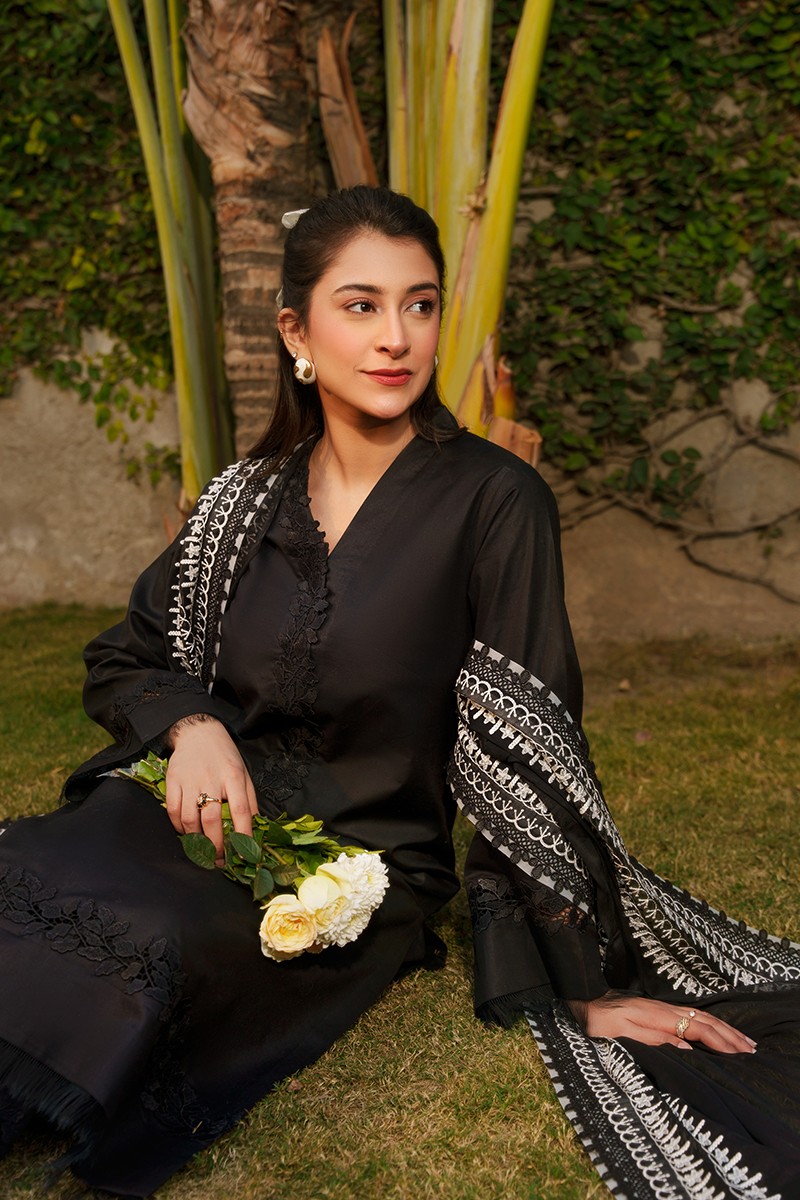 Arzu – a symphony of deep black and exquisite artistry. This three-piece ensemble, with intricately adorned dupatta borders, drapes you in quiet luxury and enduring allure.