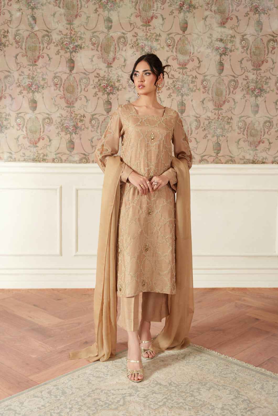 Elevate your festive wardrobe with this refined raw silk three-piece outfit, designed for timeless sophistication. The set includes a raw silk shirt, matching straight trousers, and a soft chiffon dupatta for a cohesive, luxurious look.