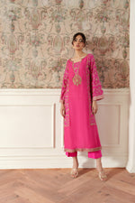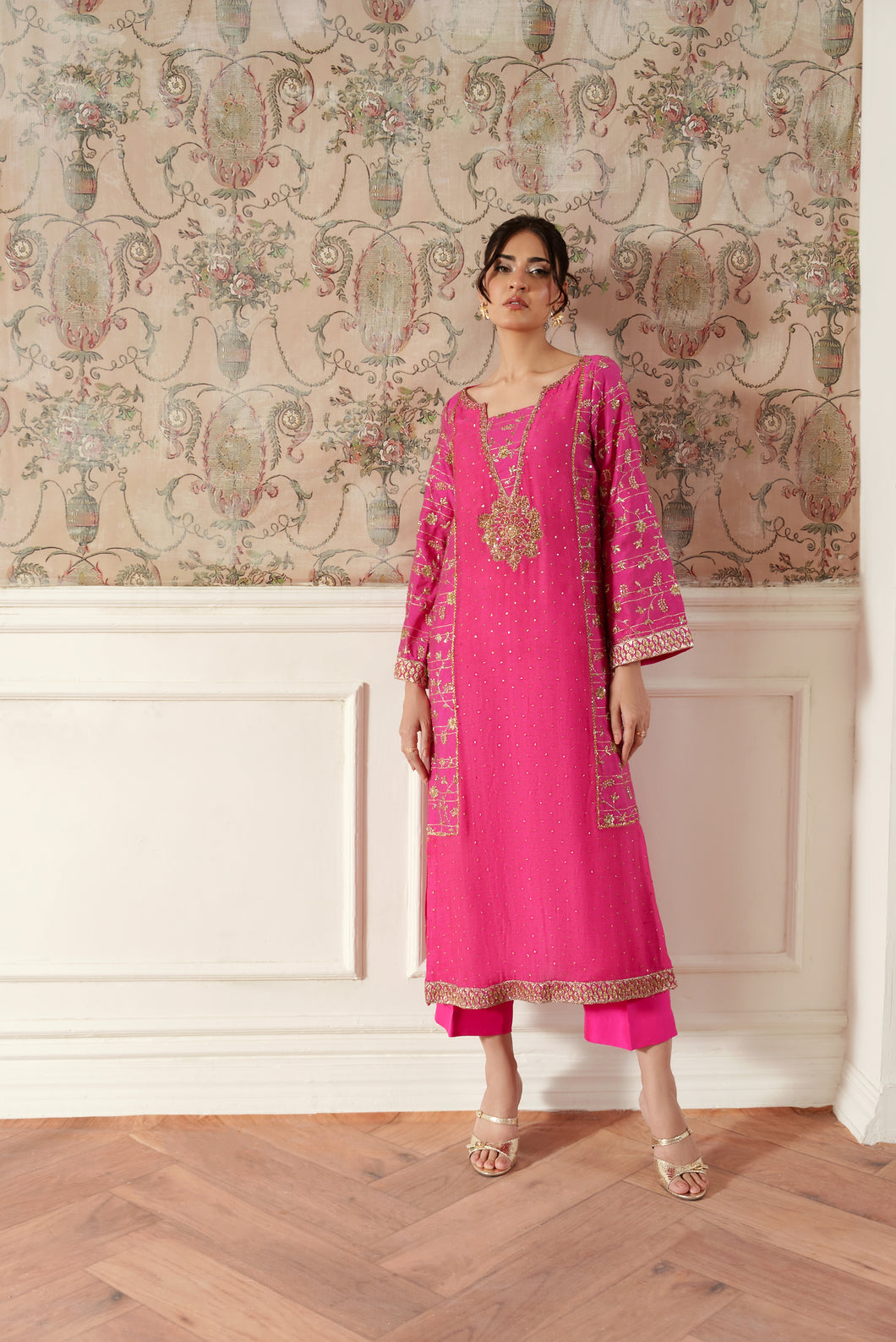 Make a striking style statement with this vibrant hot pink two-piece viscose ensemble, designed to blend festive charm with modern elegance. Crafted from soft, flowy viscose, the outfit drapes beautifully, offering effortless comfort and sophistication.