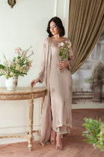 This graceful satin silk ensemble offers a smooth, fluid drape with a soft, luxurious sheen. Designed in a muted pastel tone, the outfit features a long, elegant shirt paired with matching trousers and a lightweight chiffon dupatta for a refined, cohesive look.