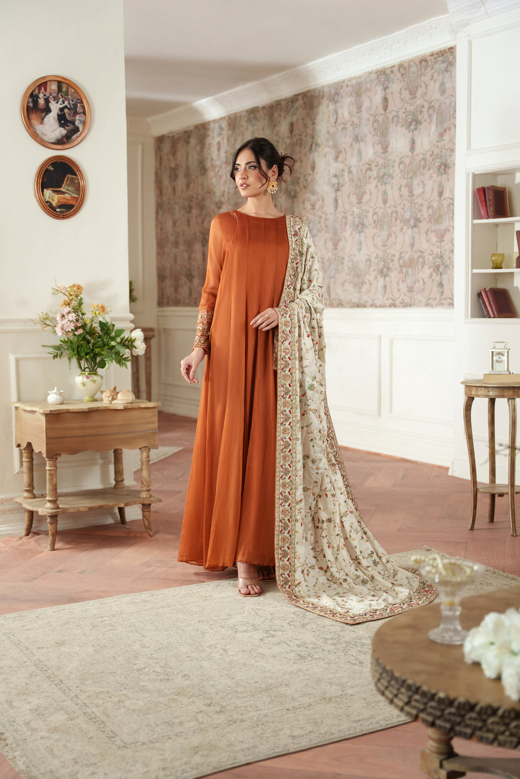 Step into timeless elegance with this rich rust-coloured pishwas ensemble, paired with a beautifully crafted raw silk shawl. The warm rust tone lends a regal, earthy appeal, while the flowing silhouette enhances the outfit’s graceful and sophisticated presence.
