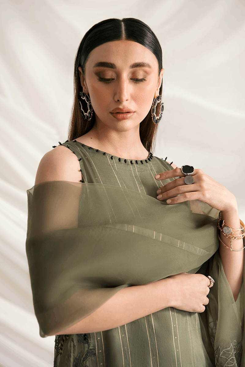 Embrace effortless elegance with the Ixora ensemble in Green. This exquisite outfit features a harmonious blend of luxurious fabrics: