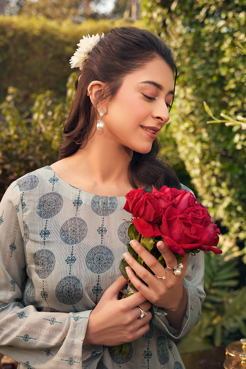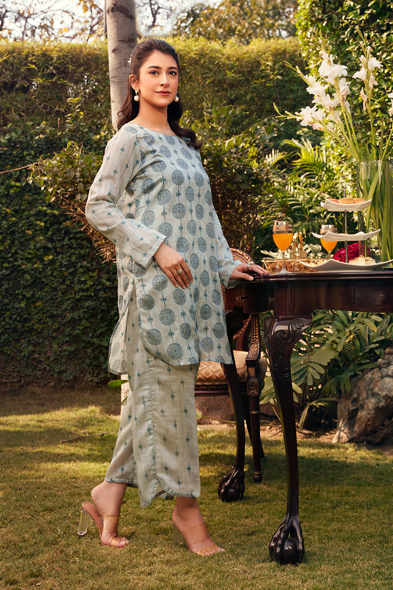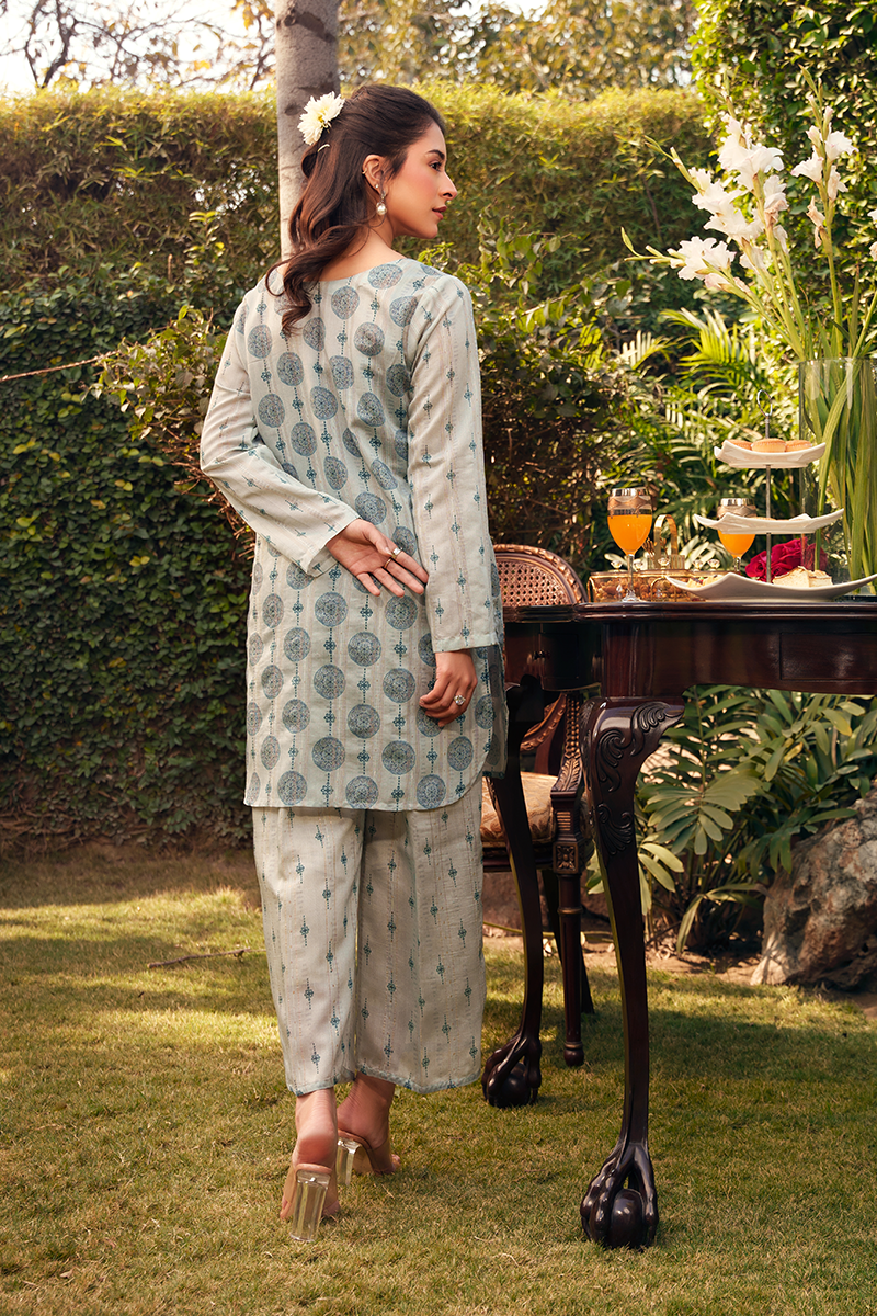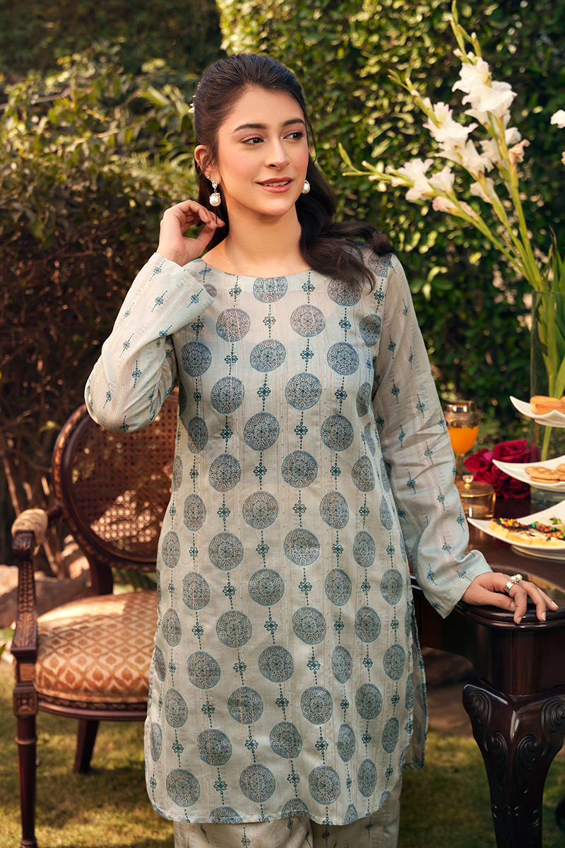 Zennia is a two-piece ensemble in a light blue, featuring a subtle, tonal circular floral pattern. Crafted from viscose, the dress offers a comfortable drape. This versatile style is suitable for a range of occasions.