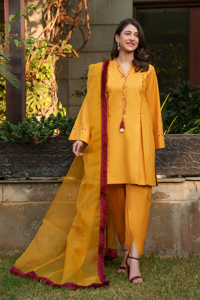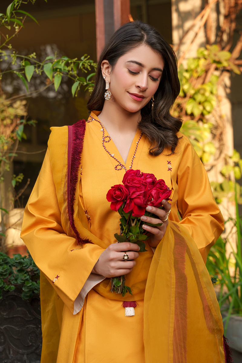 Product Description: Daania from Panache is a gorgeous three-piece set in a vibrant seasonal yellow, perfect for making a statement. The chic bottoms and airy dupatta come together for an effortlessly elegant look. Its bright colour and beautiful design make it a standout choice for any occasion.