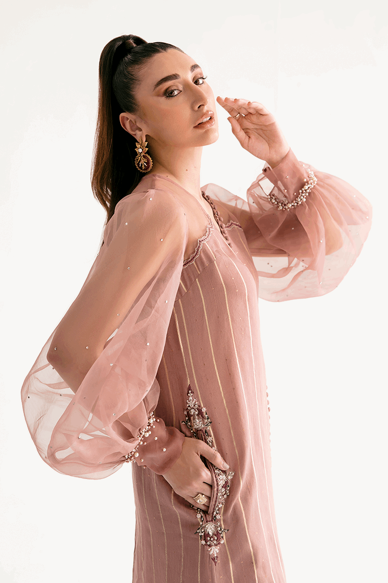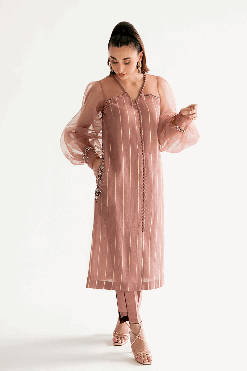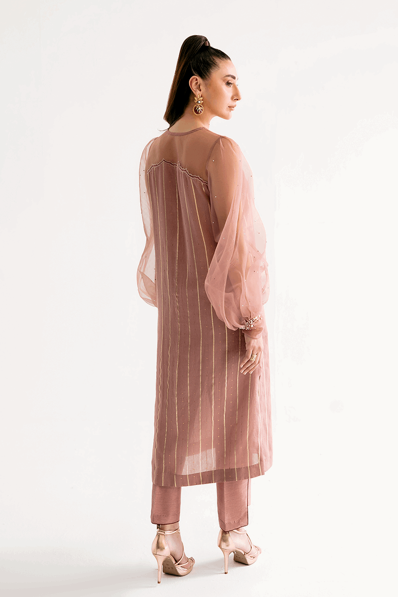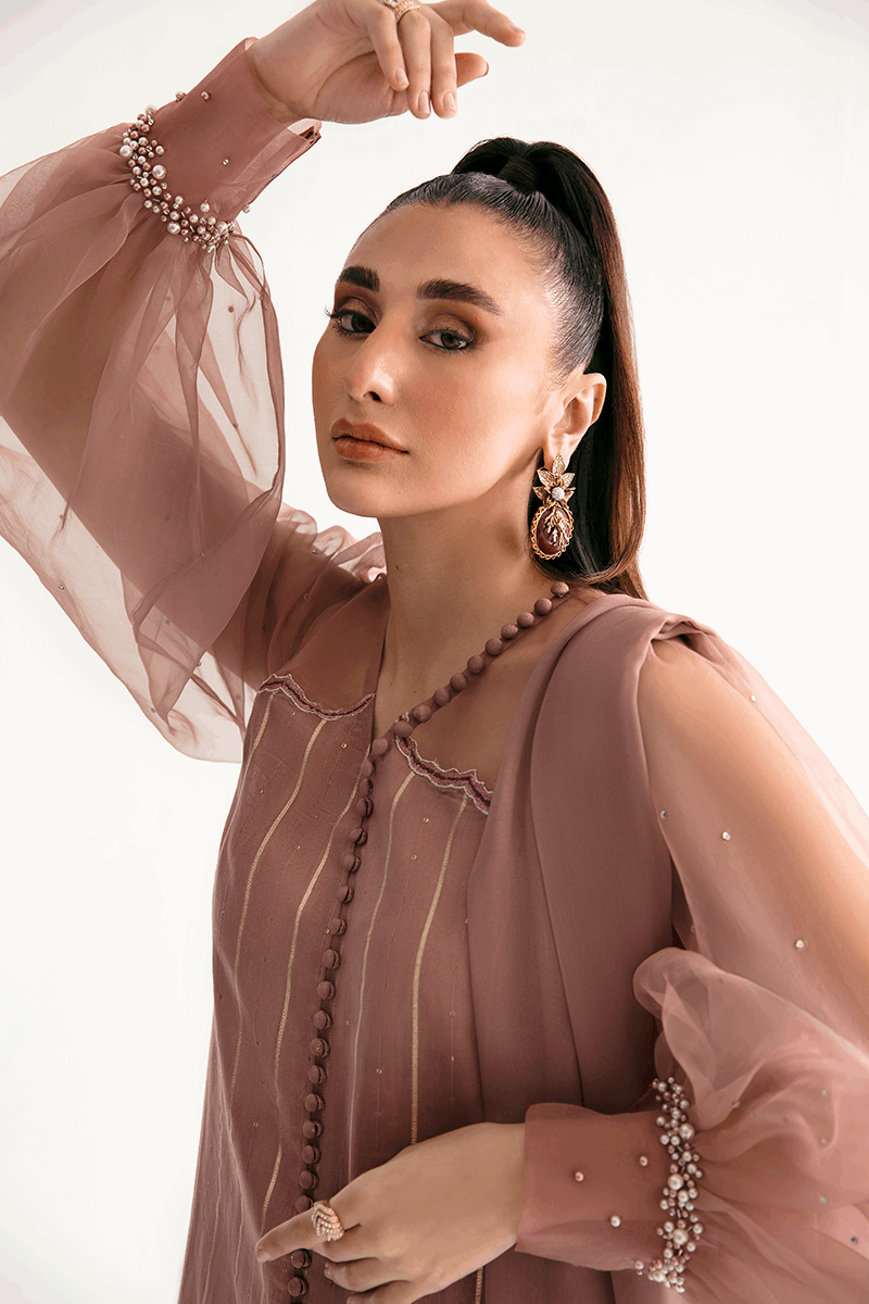 Embrace understated elegance with the Elixar ensemble in Mauve Taupe. This unique outfit features a harmonious blend of luxurious fabrics: