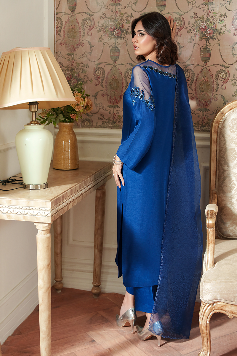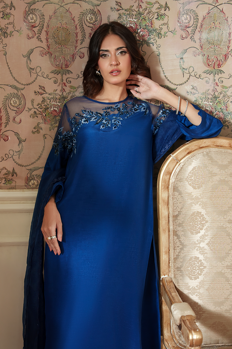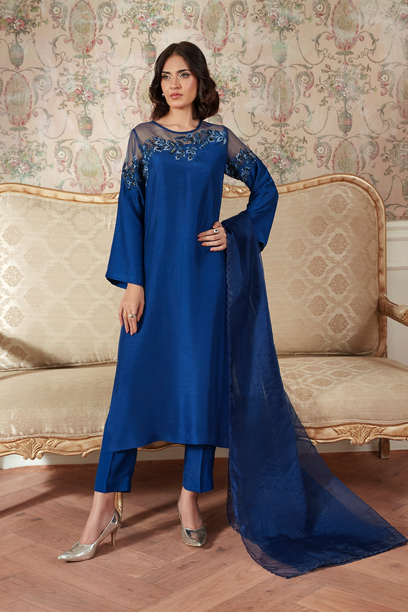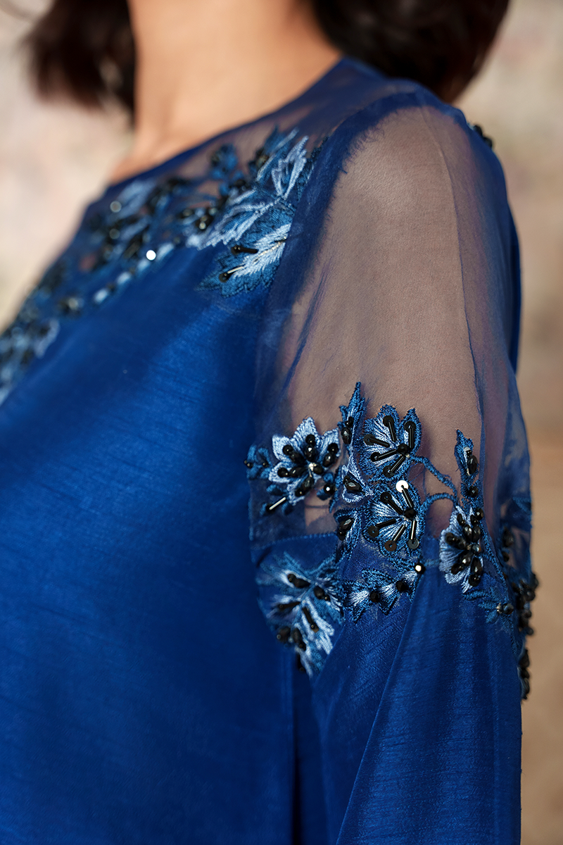 Step into effortless elegance with Emira—a stunning teal blue ensemble crafted from luxurious Korean raw silk. The design features delicately embroidered leafy motifs along the neckline, adding a touch of natural grace.