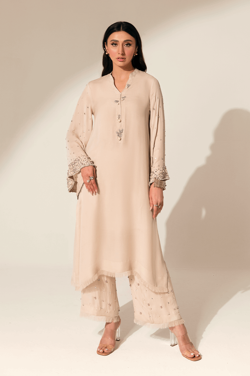 Embrace effortless elegance with the LARISA Grey Beige Ensemble. This exquisite outfit features: