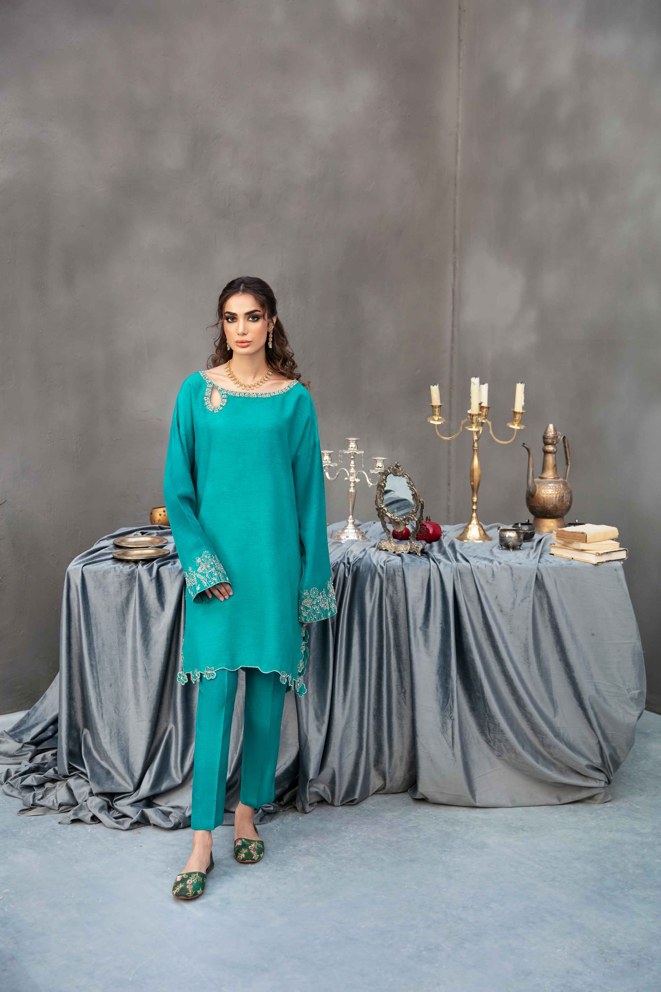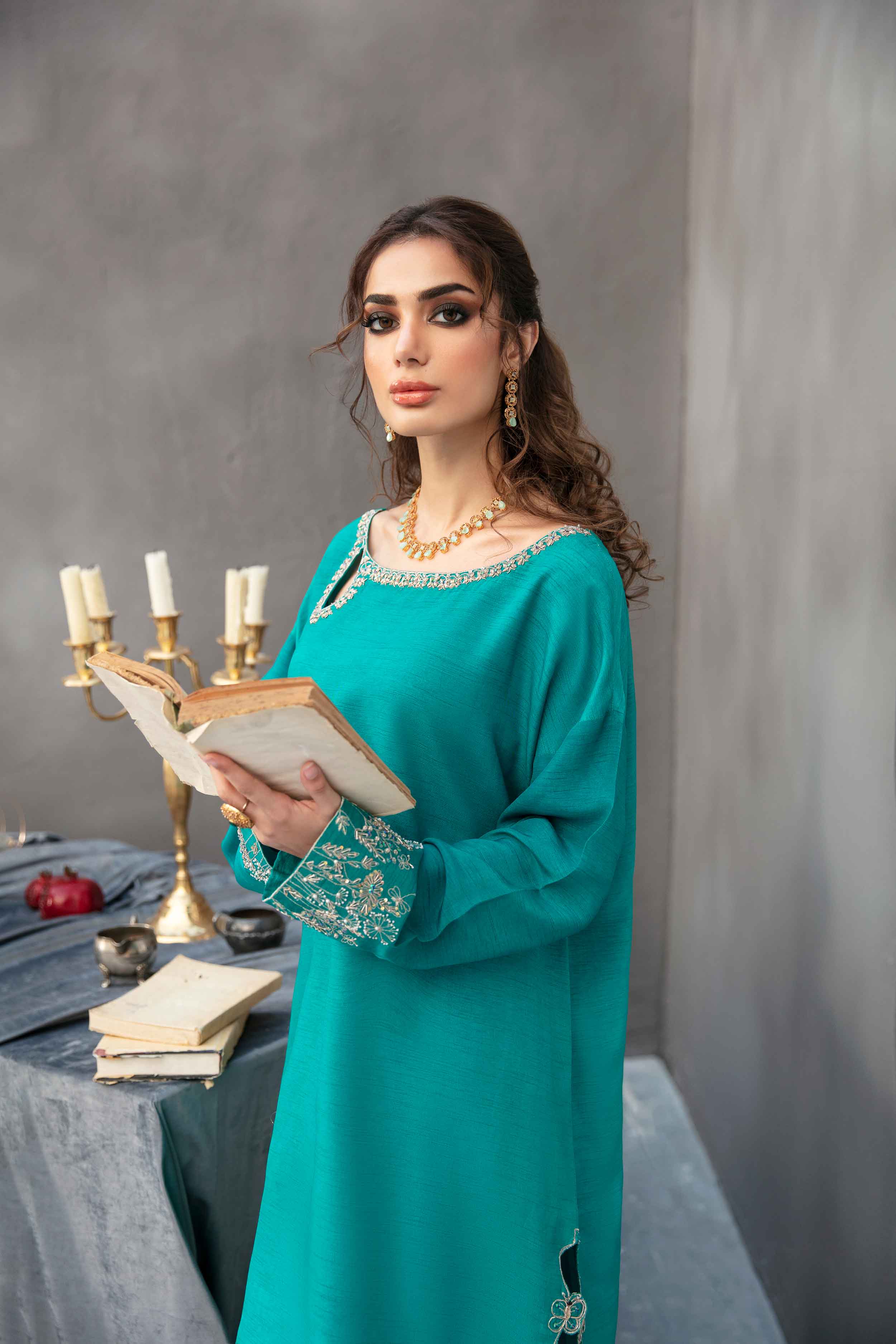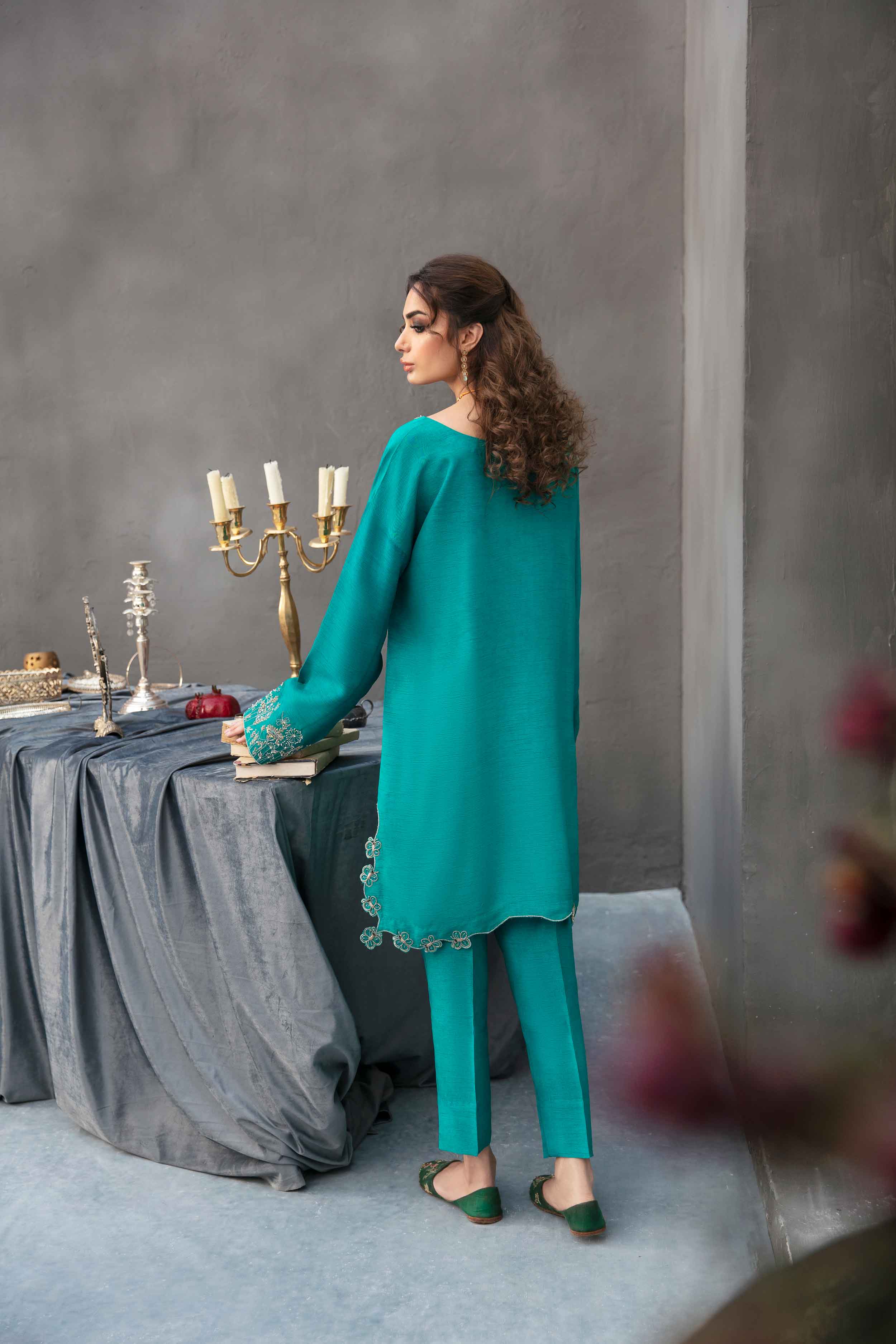 Drape yourself in sophistication with our Teal Green two-piece suit. The raw silk shirt and trouser boast tasteful embroidery, featuring tilla, sitari, stones, and thread. This ensemble effortlessly combines elegance and modernity, making it an ideal choice for refined occasions. Elevate your style with the captivating charm of Teal Green and the intricate detailing of embroidery.