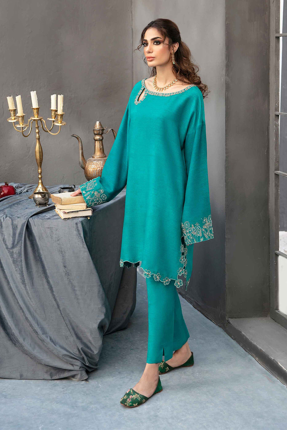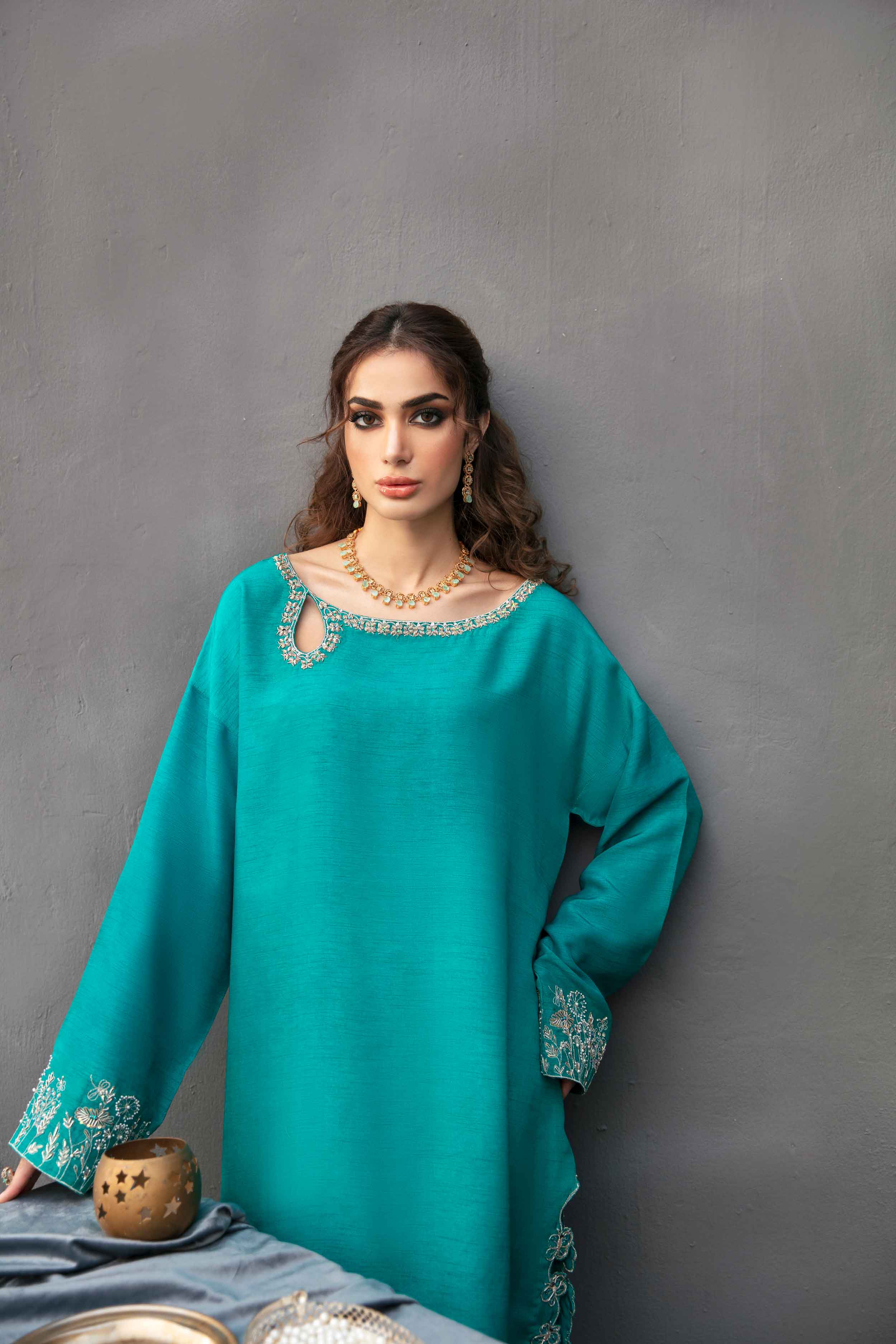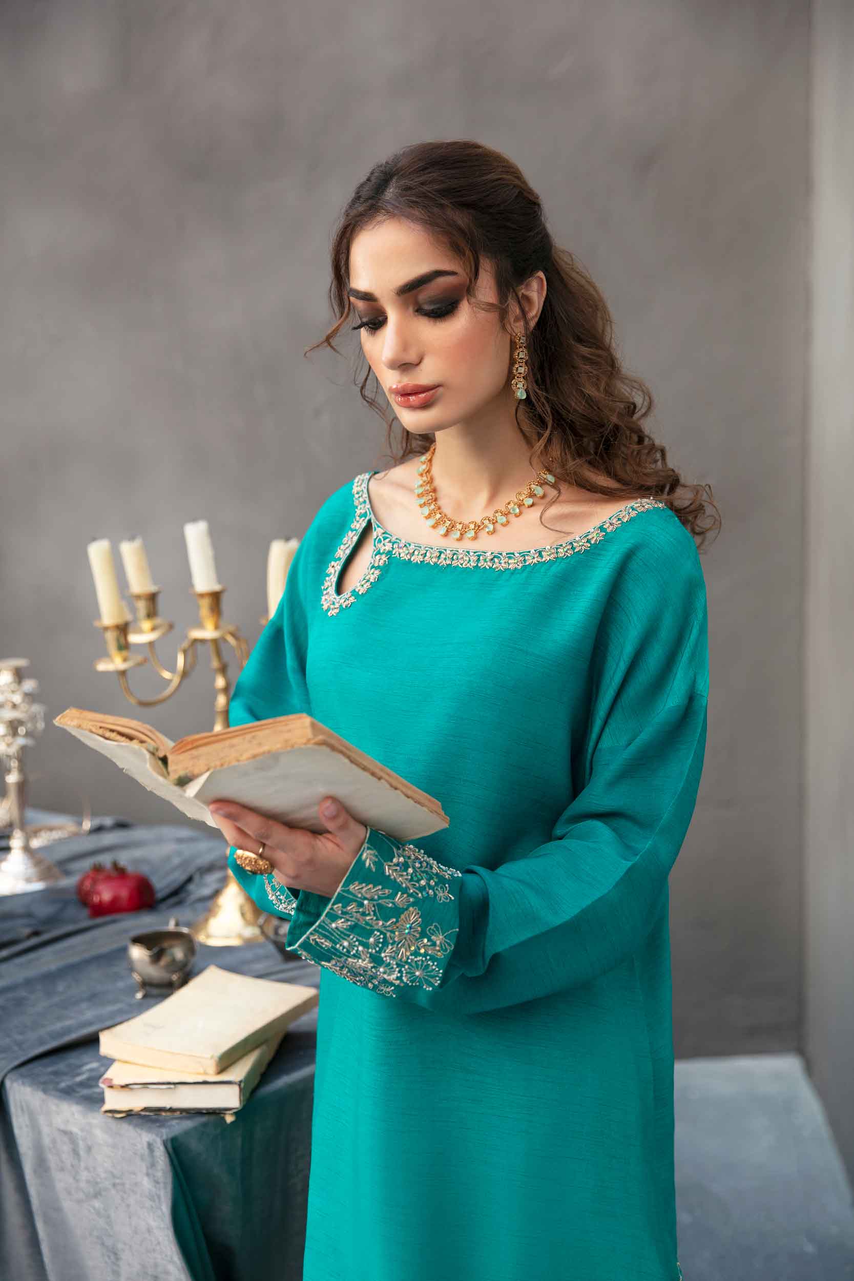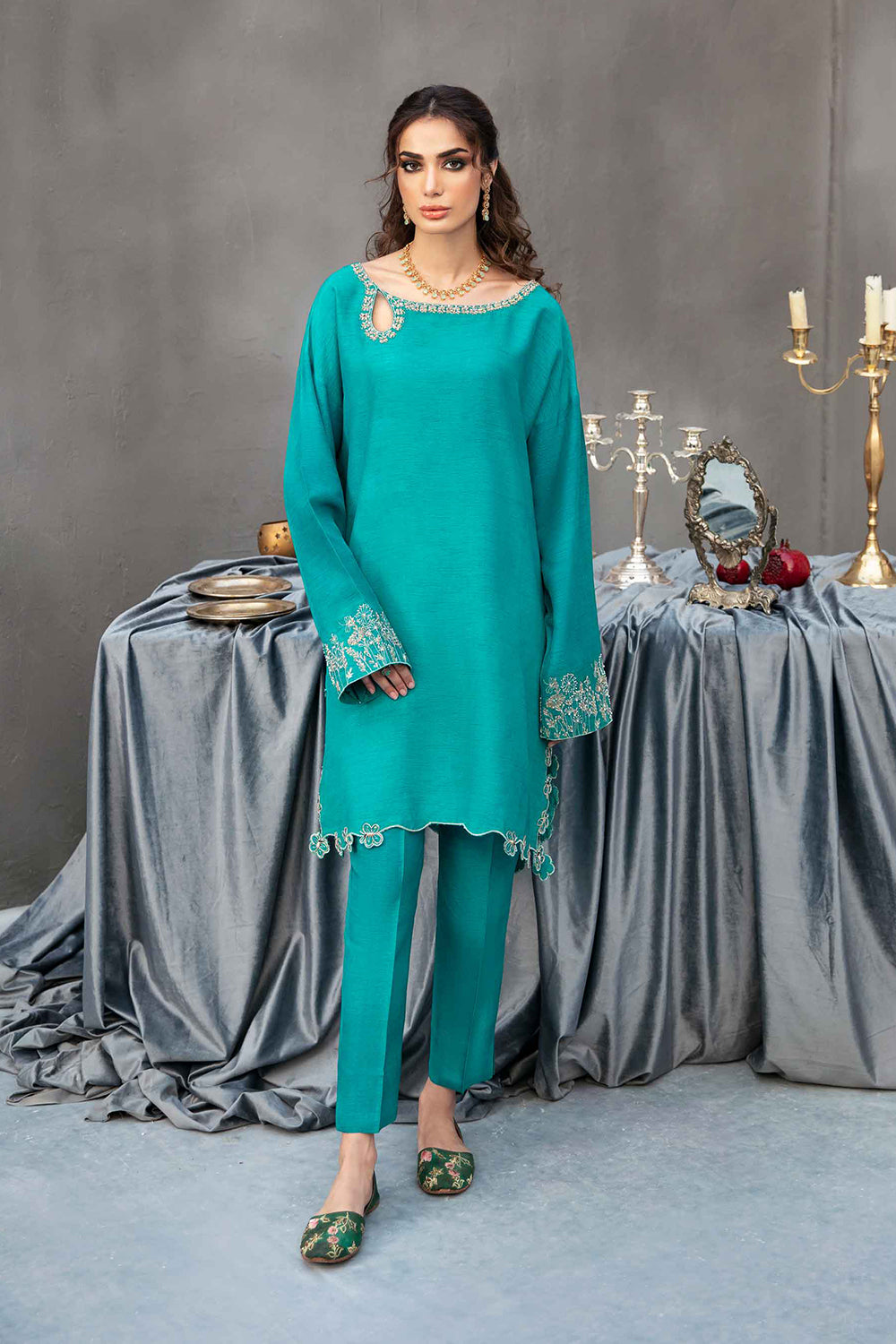 Drape yourself in sophistication with our Teal Green two-piece suit. The raw silk shirt and trouser boast tasteful embroidery, featuring tilla, sitari, stones, and thread. This ensemble effortlessly combines elegance and modernity, making it an ideal choice for refined occasions. Elevate your style with the captivating charm of Teal Green and the intricate detailing of embroidery.