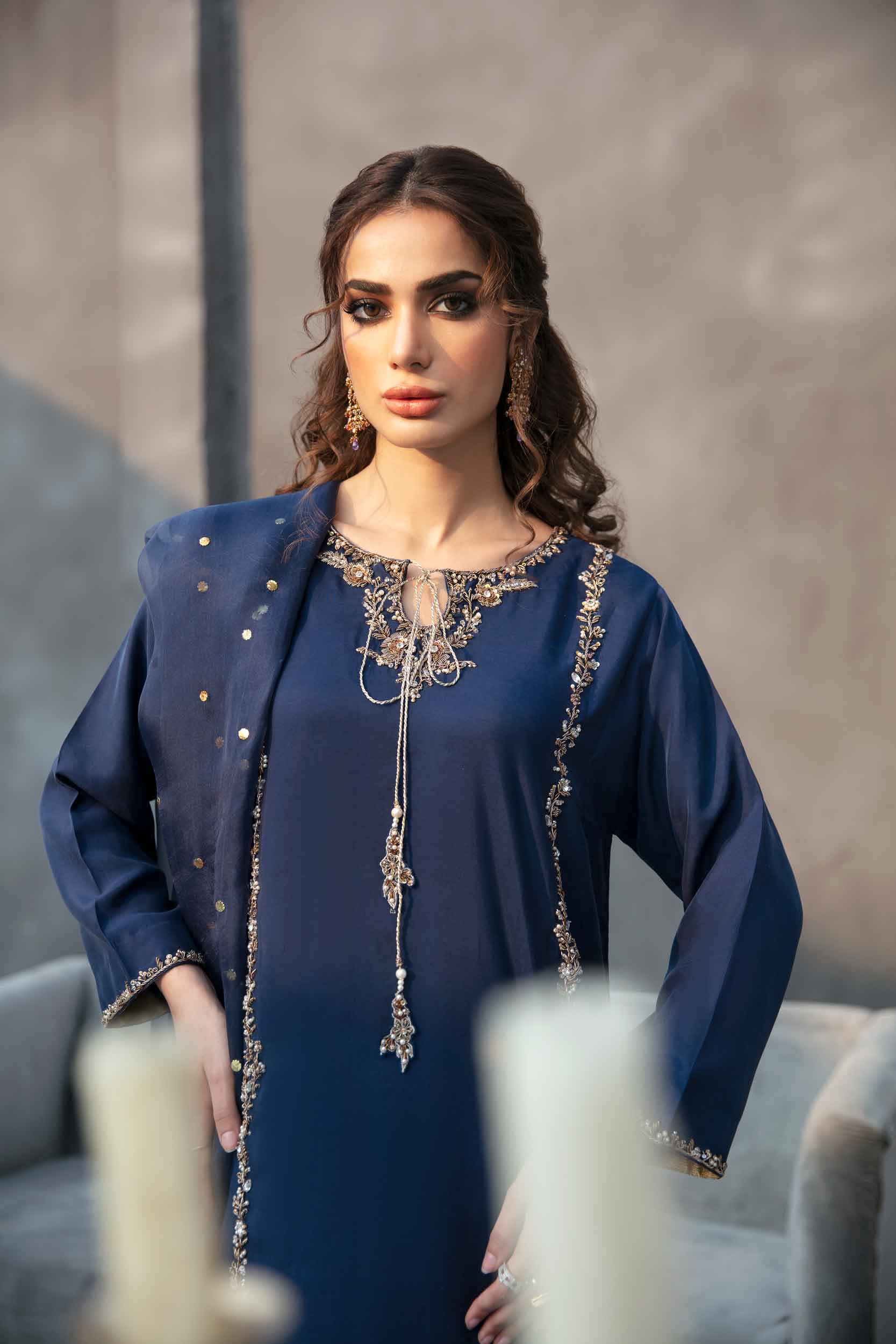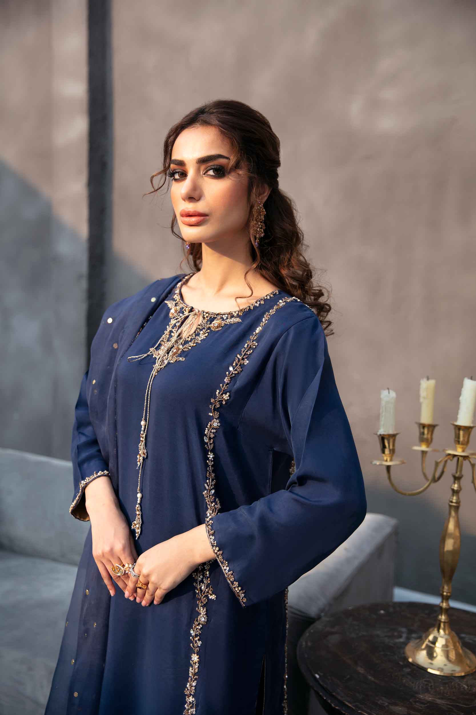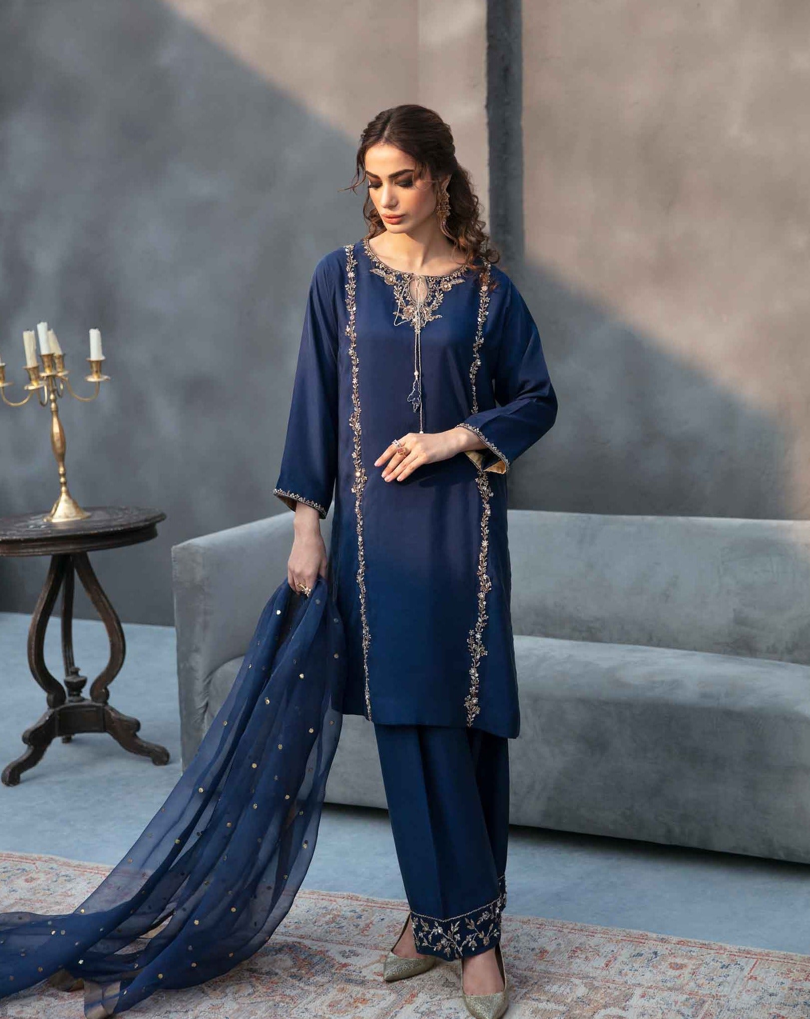 Elevate your style game with Namia – a vision in navy blue. The chic grip shirt and shalwar combo redefine modern elegance, while the sheer organza dupatta introduces a whimsical element. Step into the future of fashion with Namia, where tradition meets a bold contemporary flair.