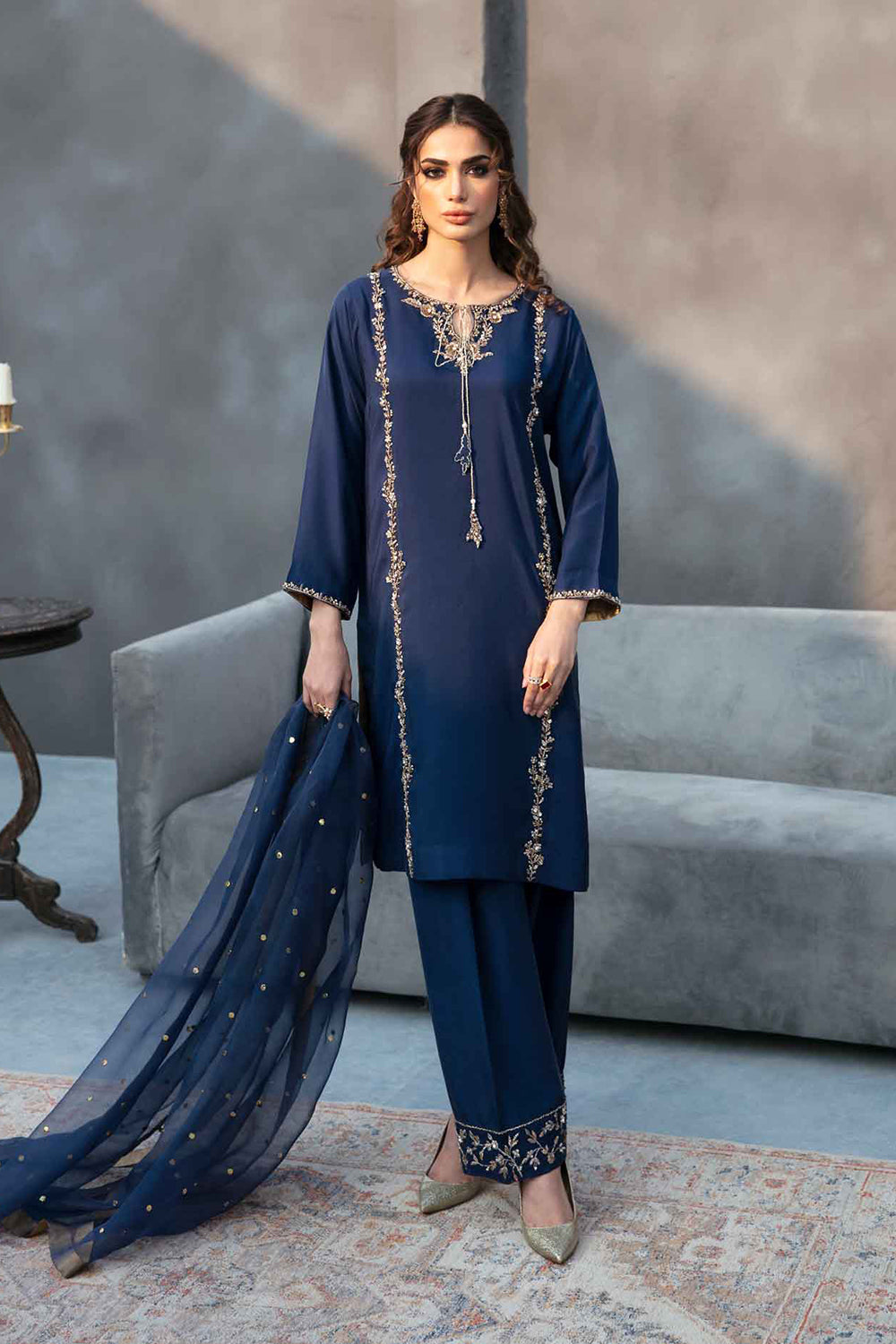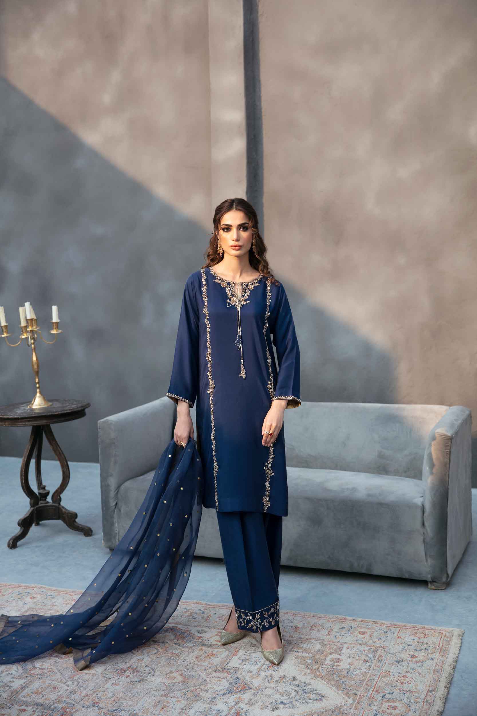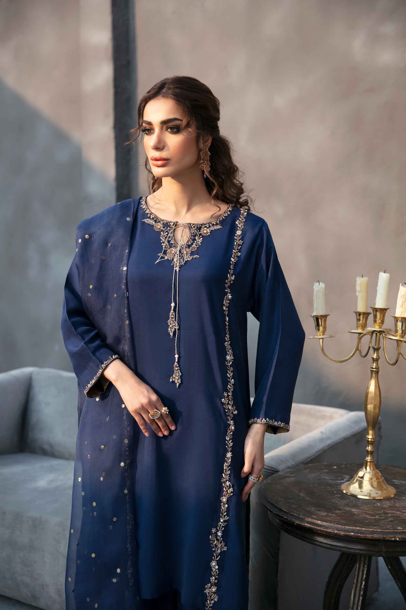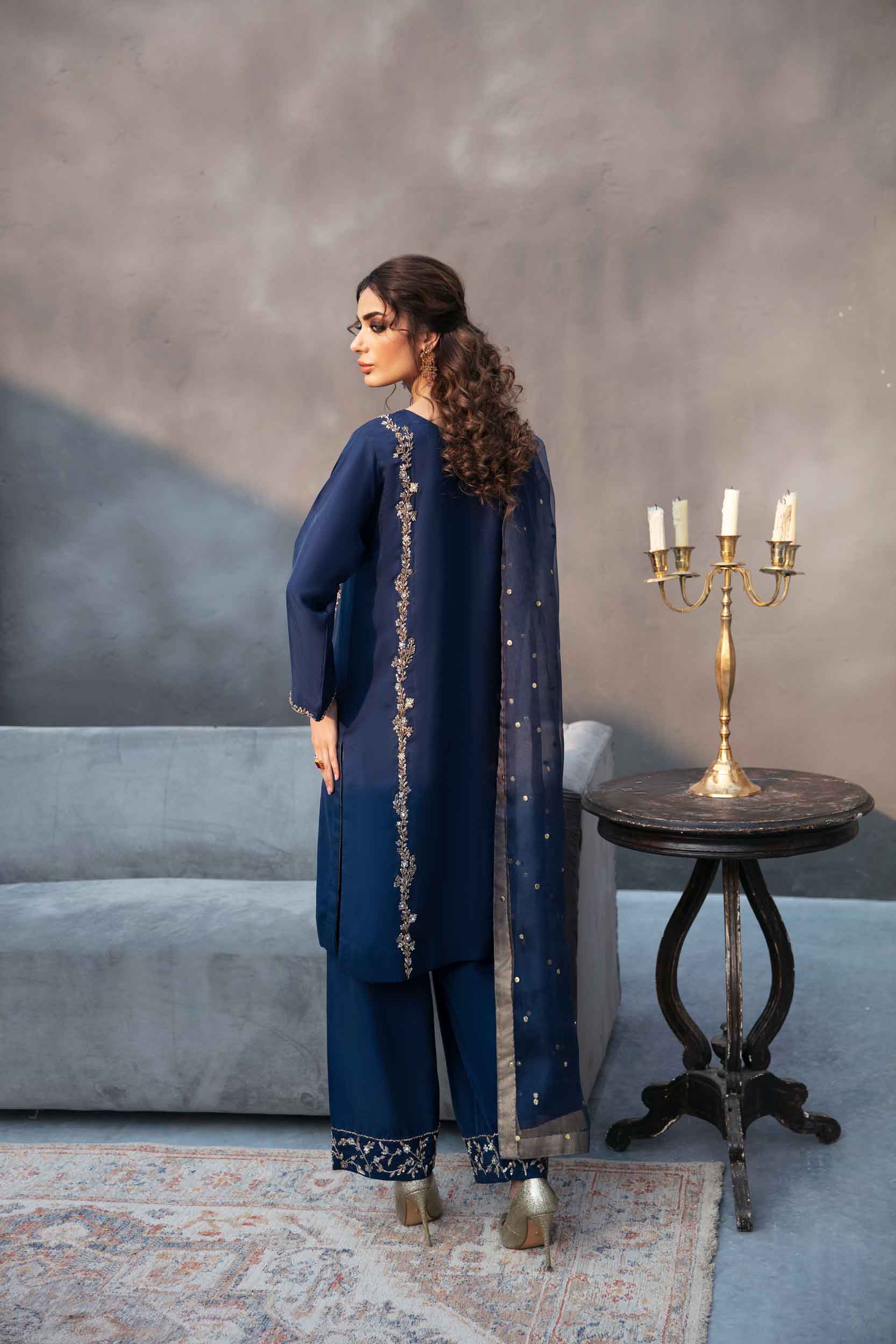 Elevate your style game with Namia – a vision in navy blue. The chic grip shirt and shalwar combo redefine modern elegance, while the sheer organza dupatta introduces a whimsical element. Step into the future of fashion with Namia, where tradition meets a bold contemporary flair.