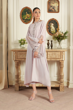 Crafted from luxurious dull crepe, the shirt features a floor-length, fluid silhouette that creates a captivating fall, enhancing the garment’s soft movement. The neckline is delicately embellished with glistening stones, creating a radiant focal point. A linear cascade of beads extends from the neckline down to the hem, adding a refined, elongated finish that draws the eye.