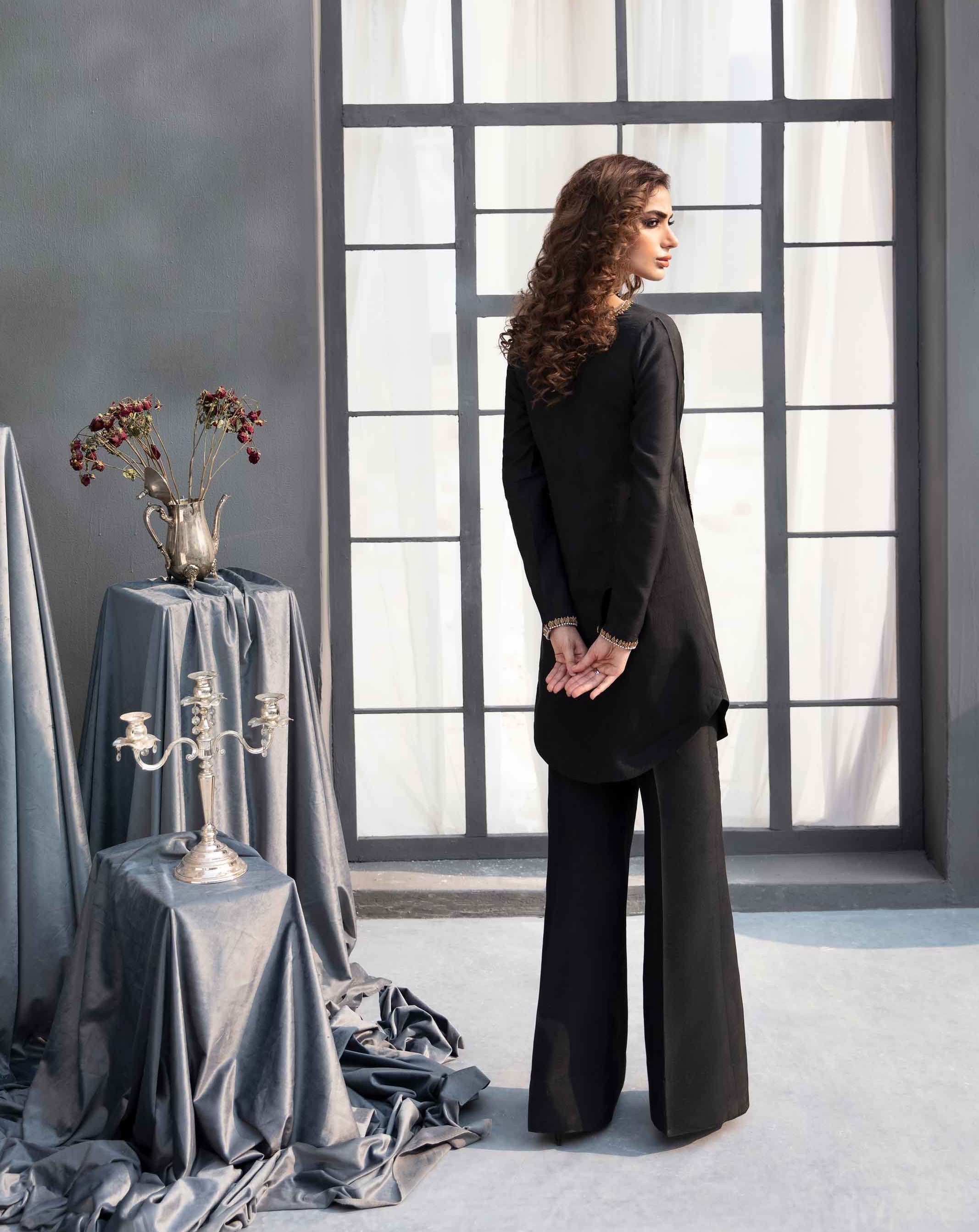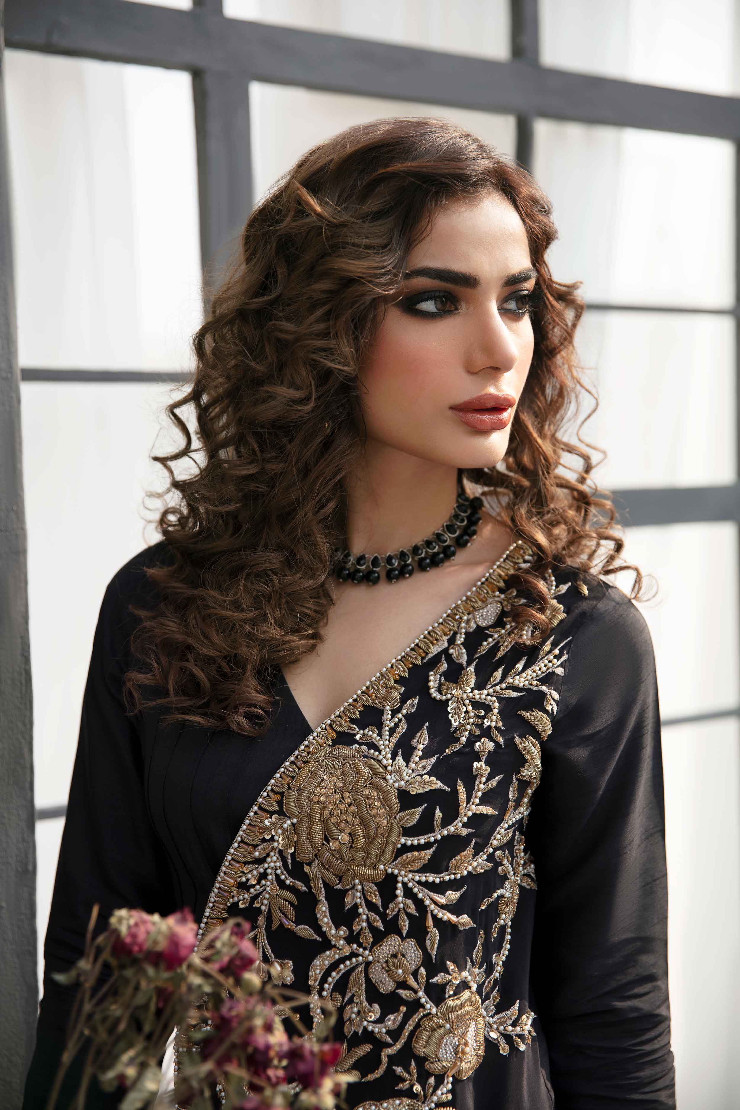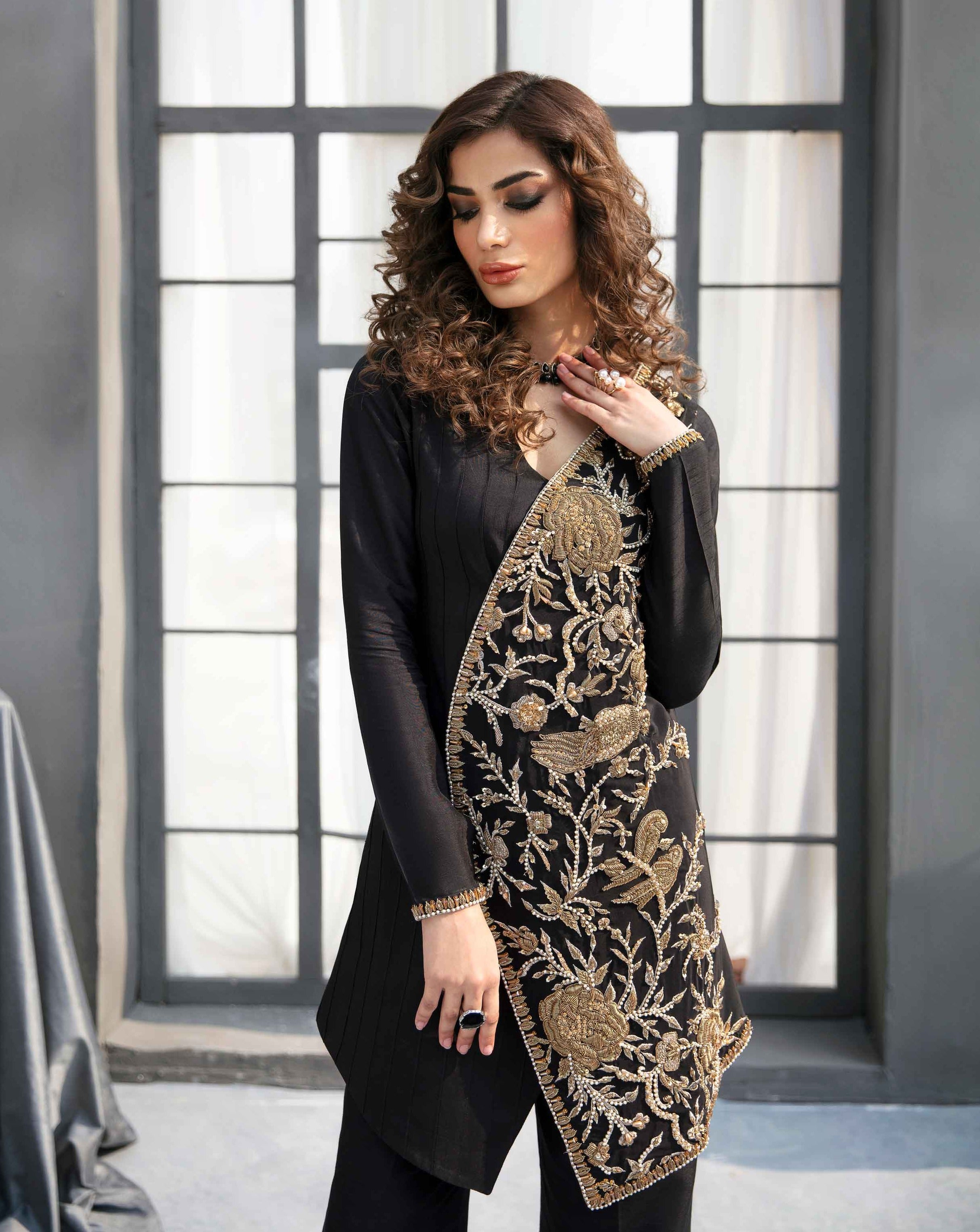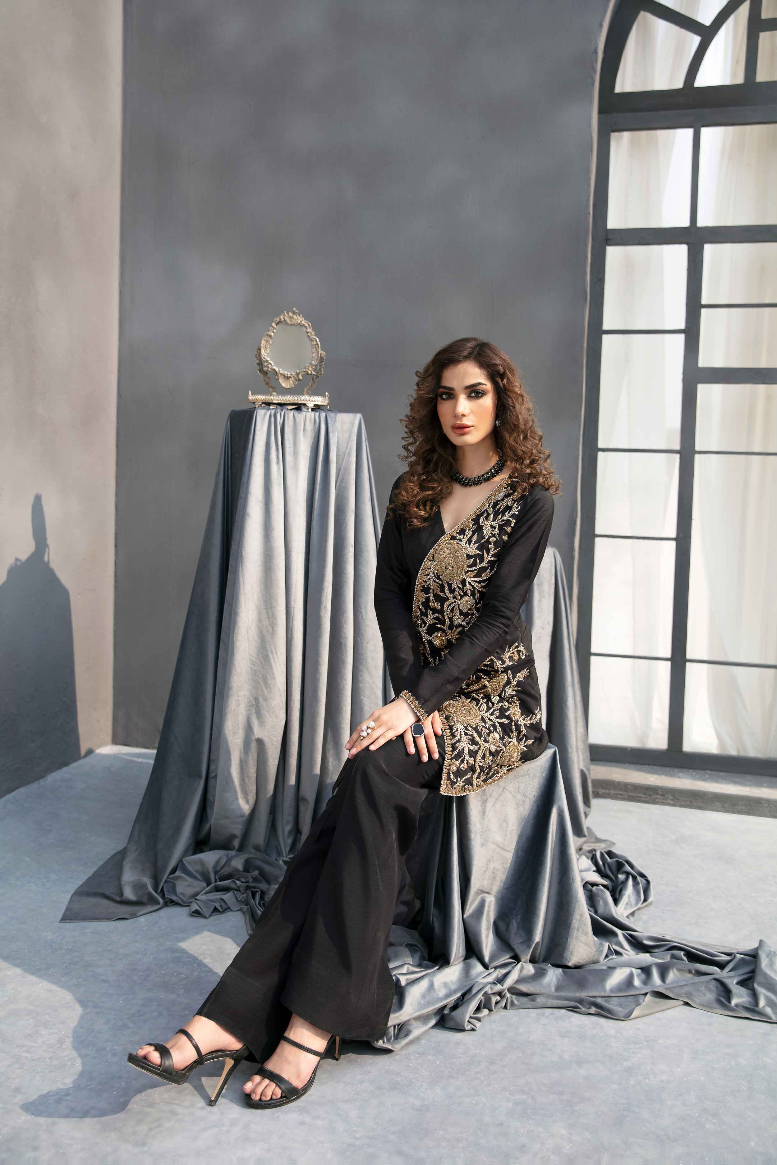 Indulge in the allure of our Black ensemble, a captivating blend of elegance and sophistication. The raw silk coat is adorned with exquisite sitari, moti, stones, and tila embroidery, creating a luxurious and timeless appeal. Paired seamlessly with a silk bottom, this ensemble is designed to make a statement at any special occasion. Embrace the richness of Black and the intricacy of detailed embroidery for a look that exudes grace and charm.