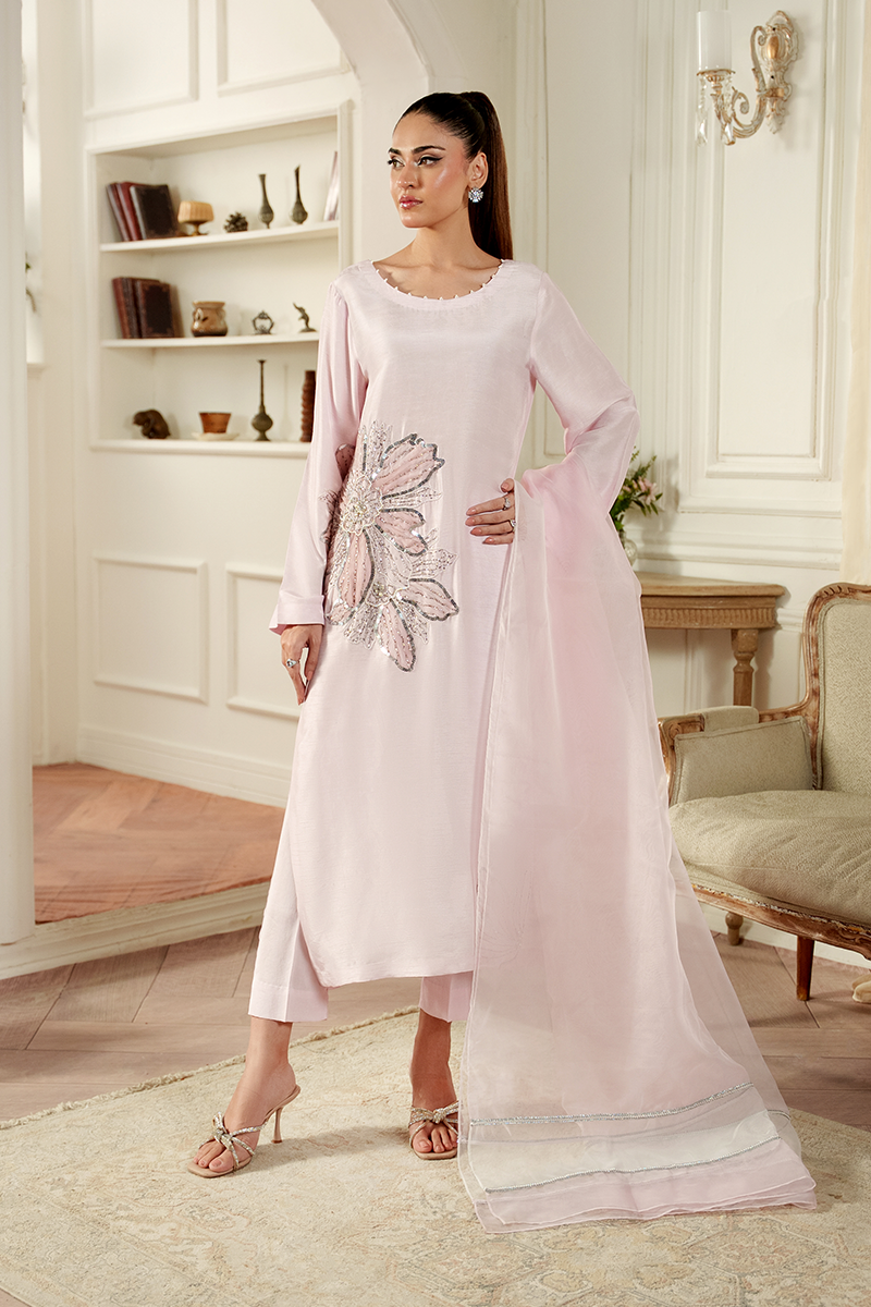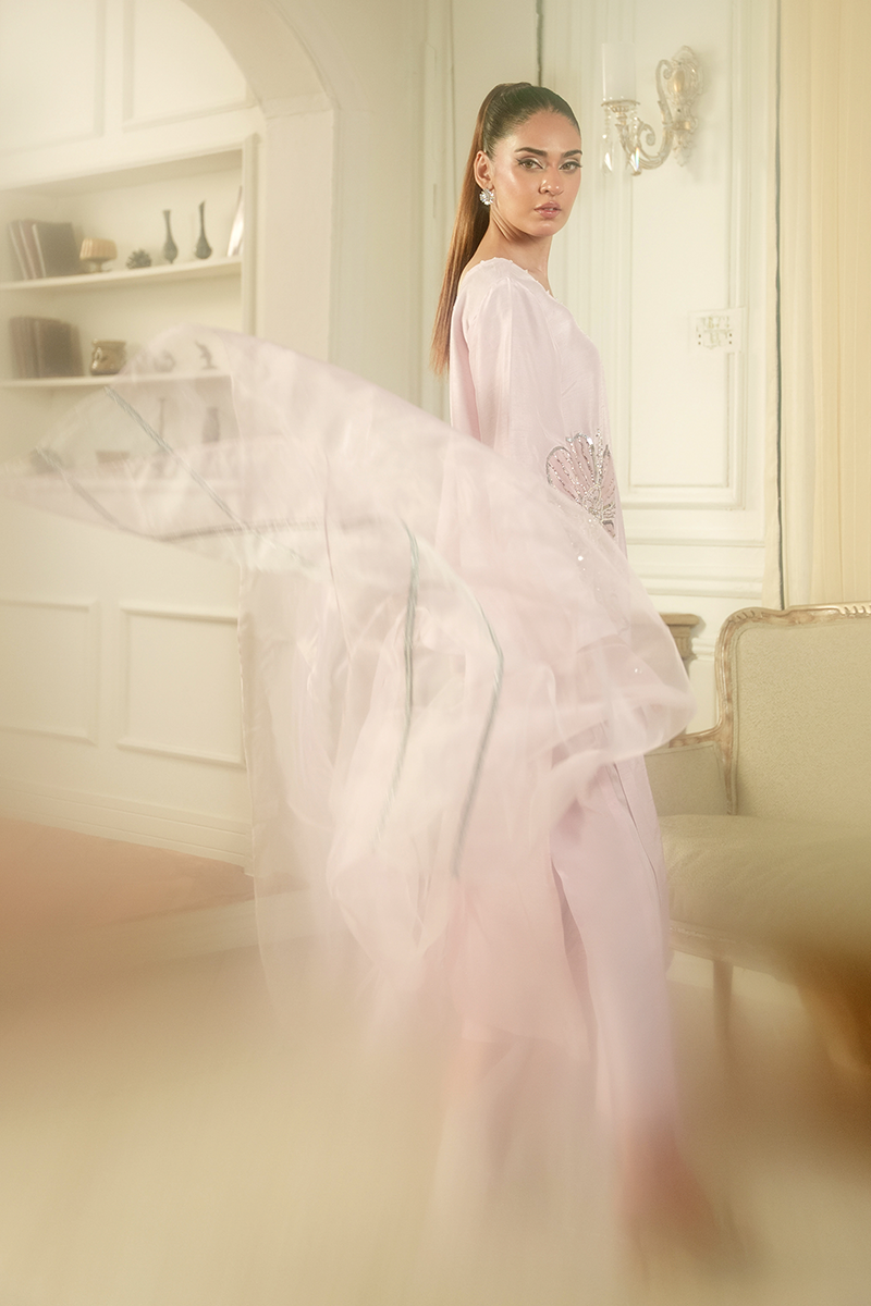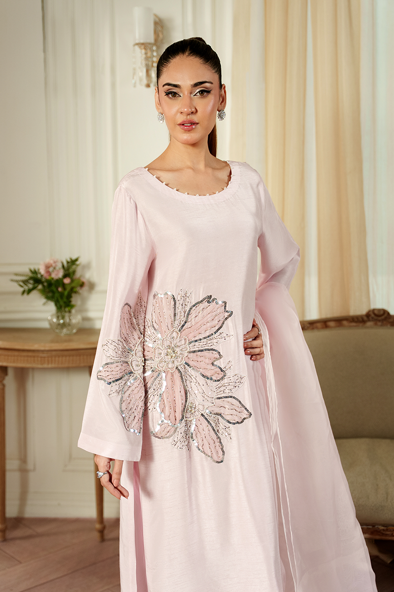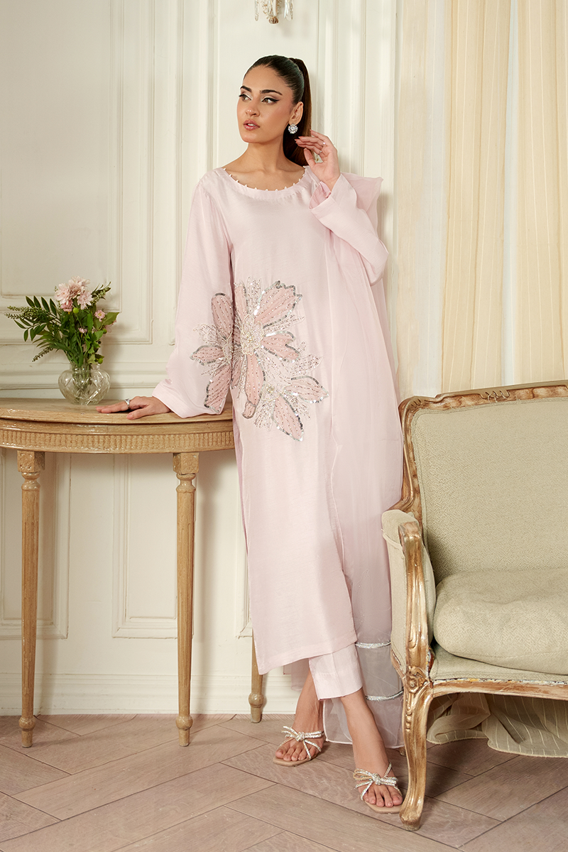 Draped in a serene powder pink hue, Valora is crafted from raw silk, designed to capture light and attention with effortless grace. The long shirt is adorned with delicate organza patches, brought to life with intricate hand embroidery. Sequins, seroski beads, and meticulous threadwork create blooming floral motifs in shades of silver and soft pink, adding a radiant shimmer that elevates the entire look.