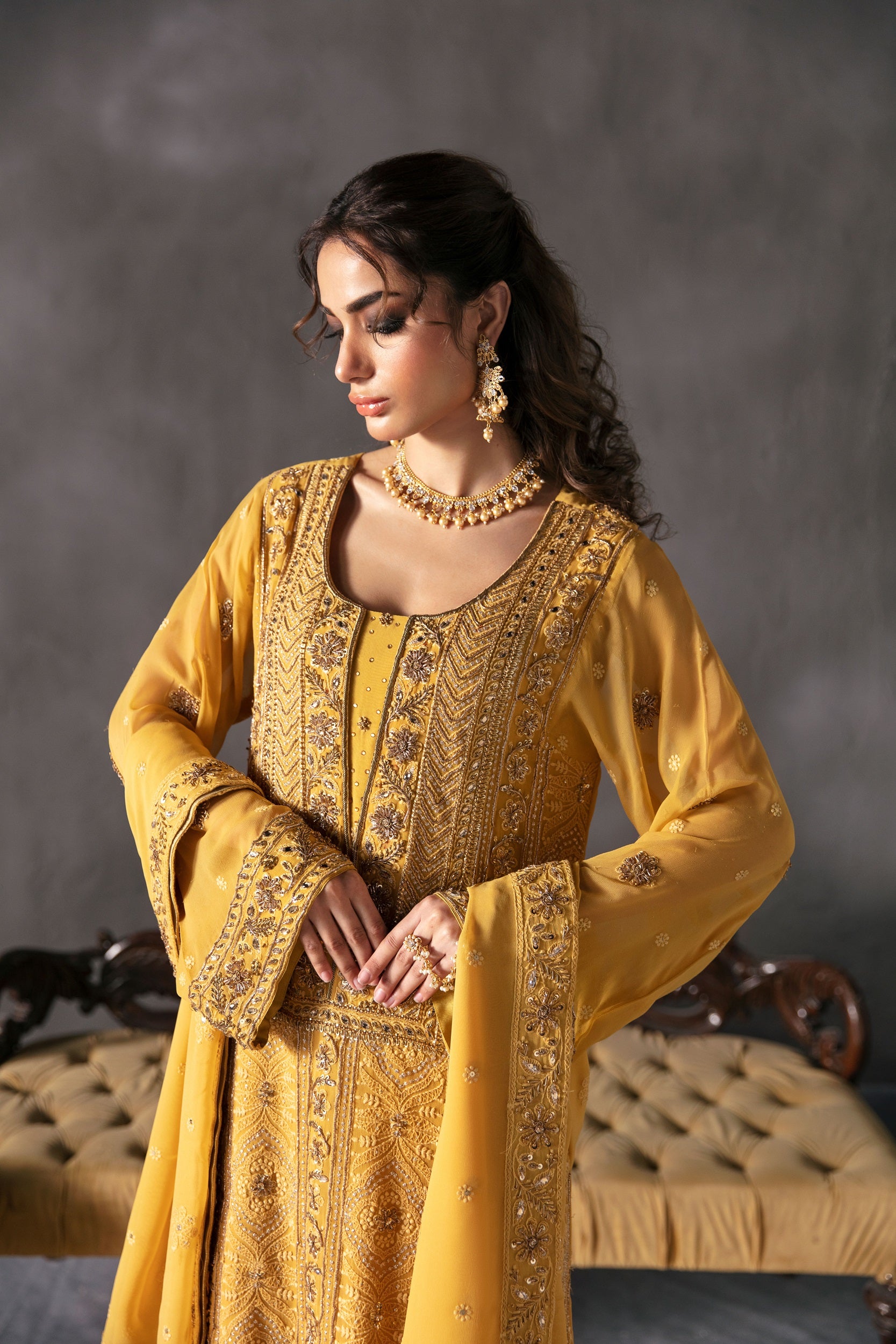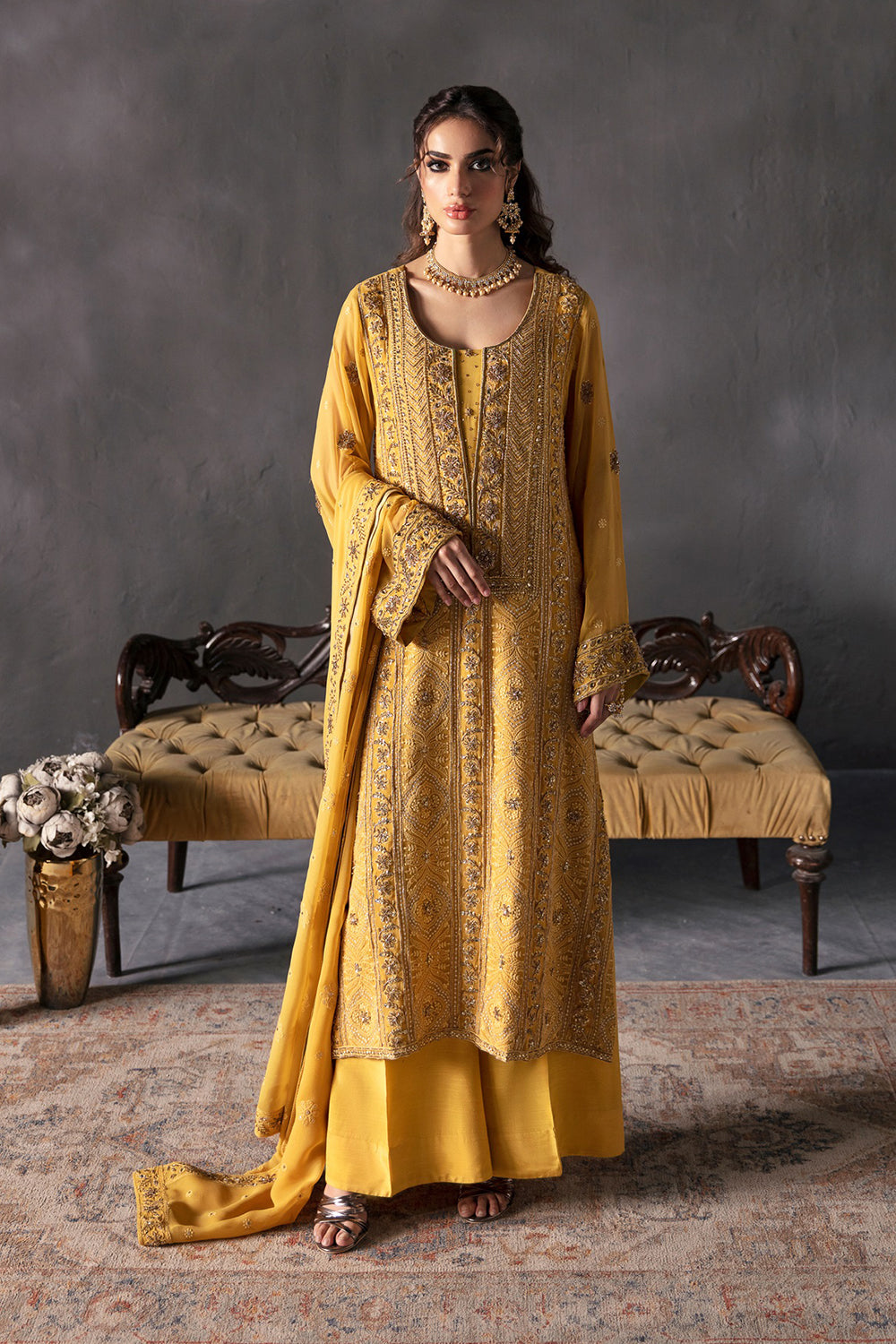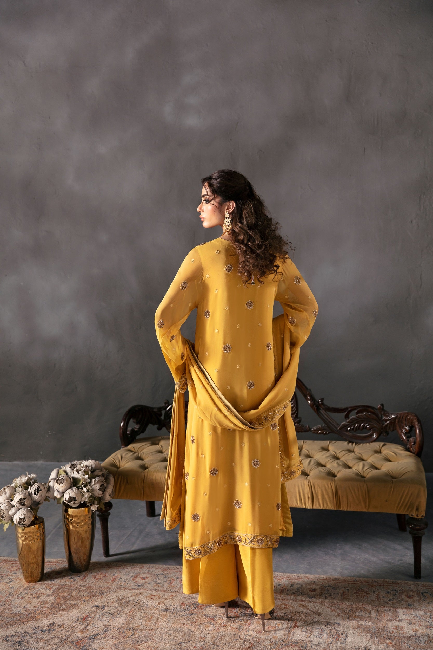 Elevate your style game with the contemporary allure of Zarpash in Mustard. This chiffon shirt paired with raw silk trousers and a matching chiffon dupatta is the epitome of modern sophistication. Step into a world of elegance and grace.
