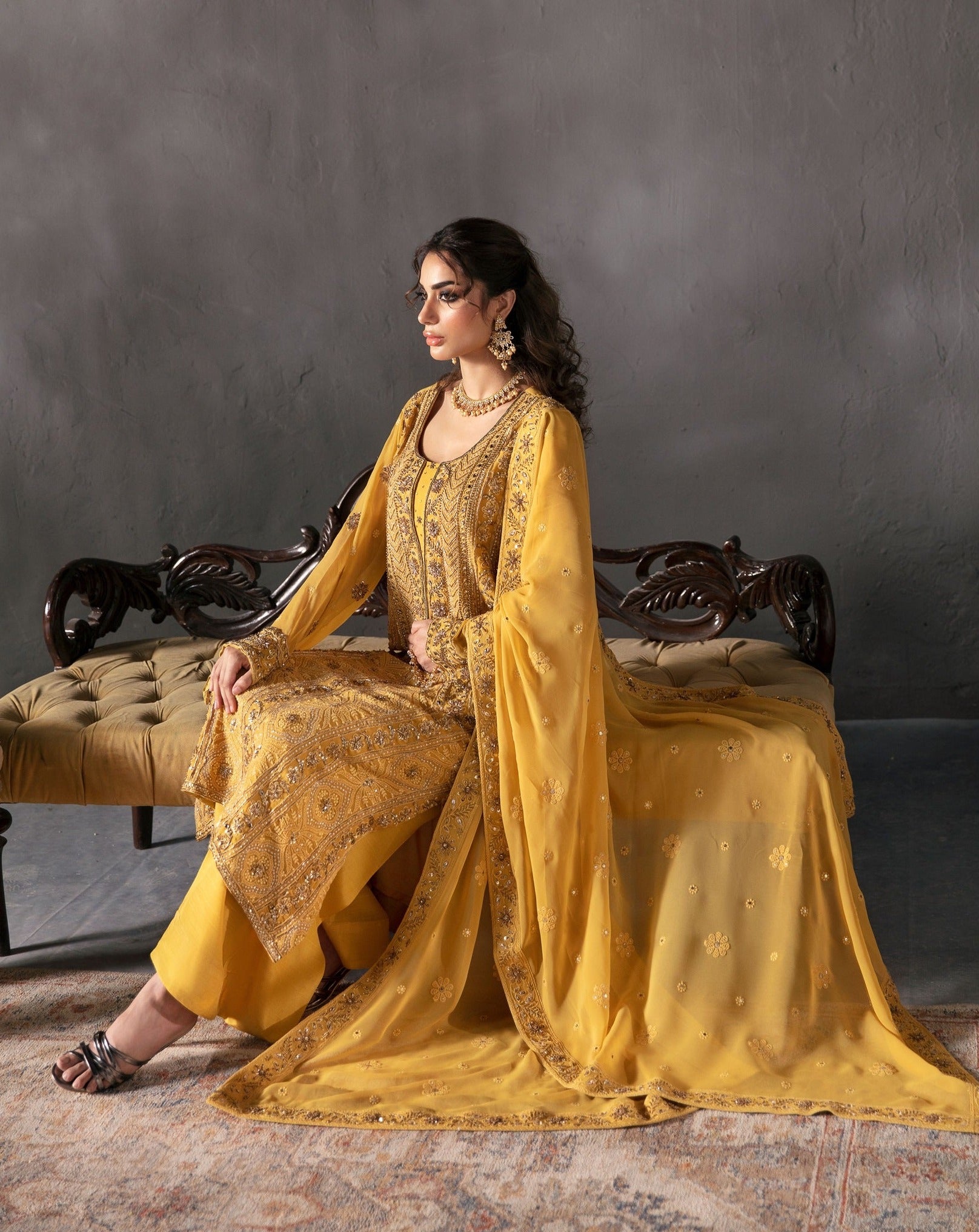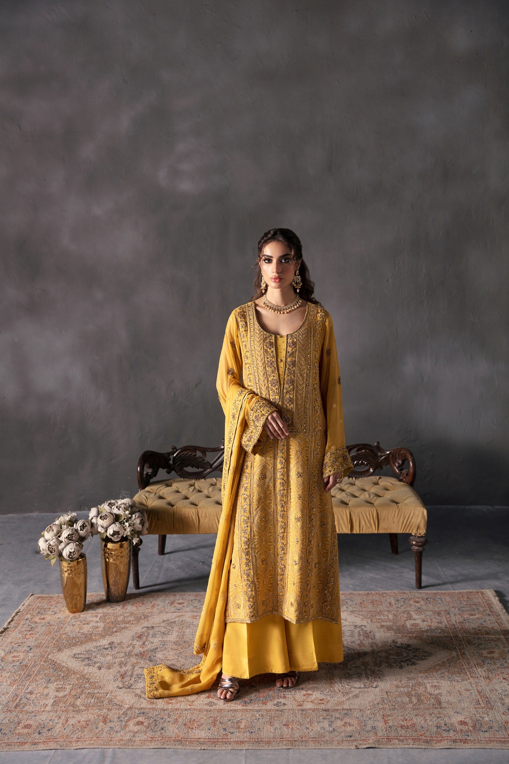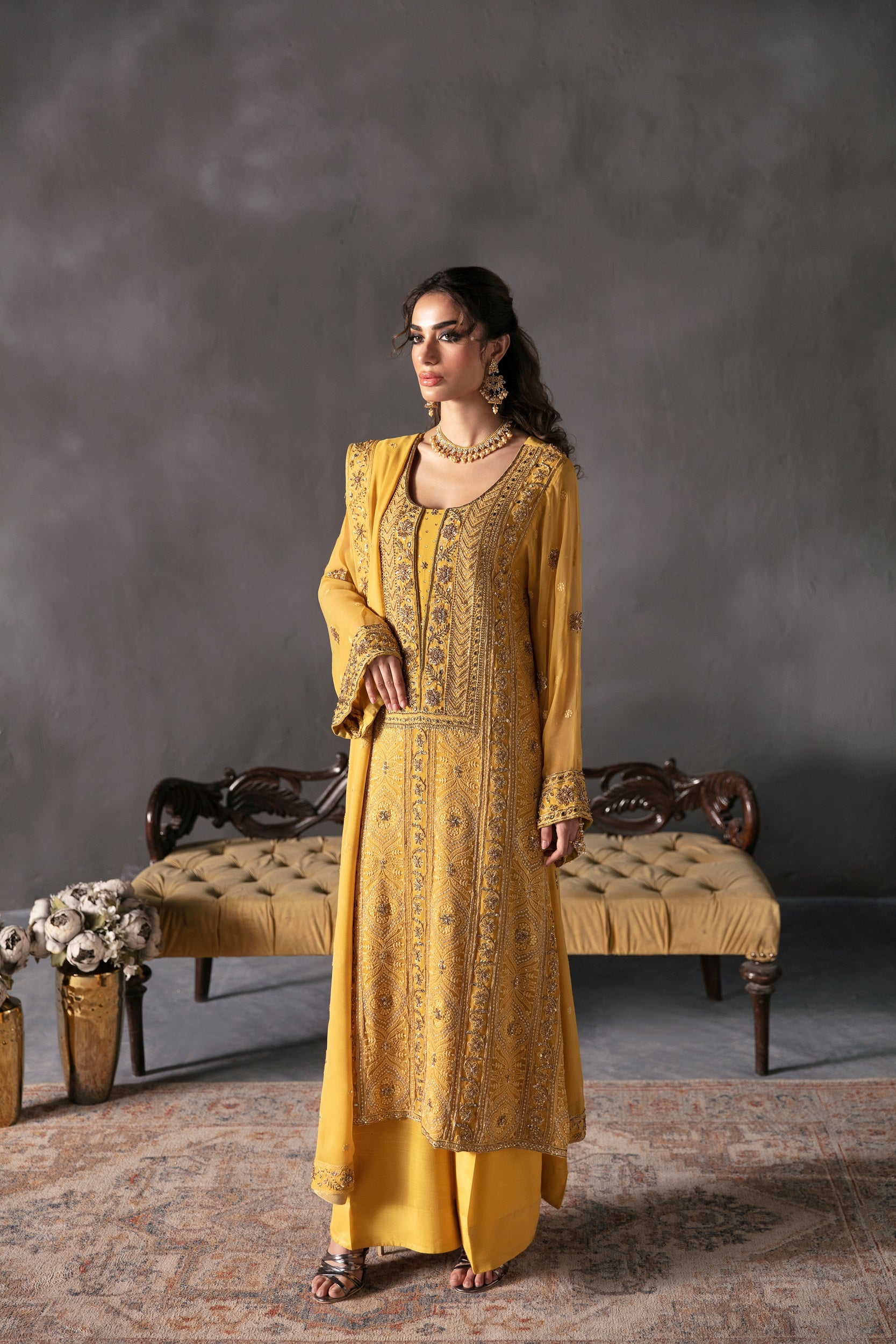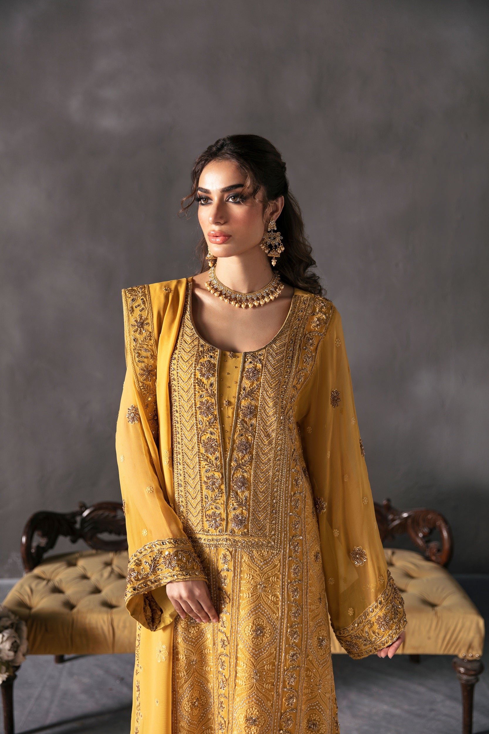 Elevate your style game with the contemporary allure of Zarpash in Mustard. This chiffon shirt paired with raw silk trousers and a matching chiffon dupatta is the epitome of modern sophistication. Step into a world of elegance and grace.